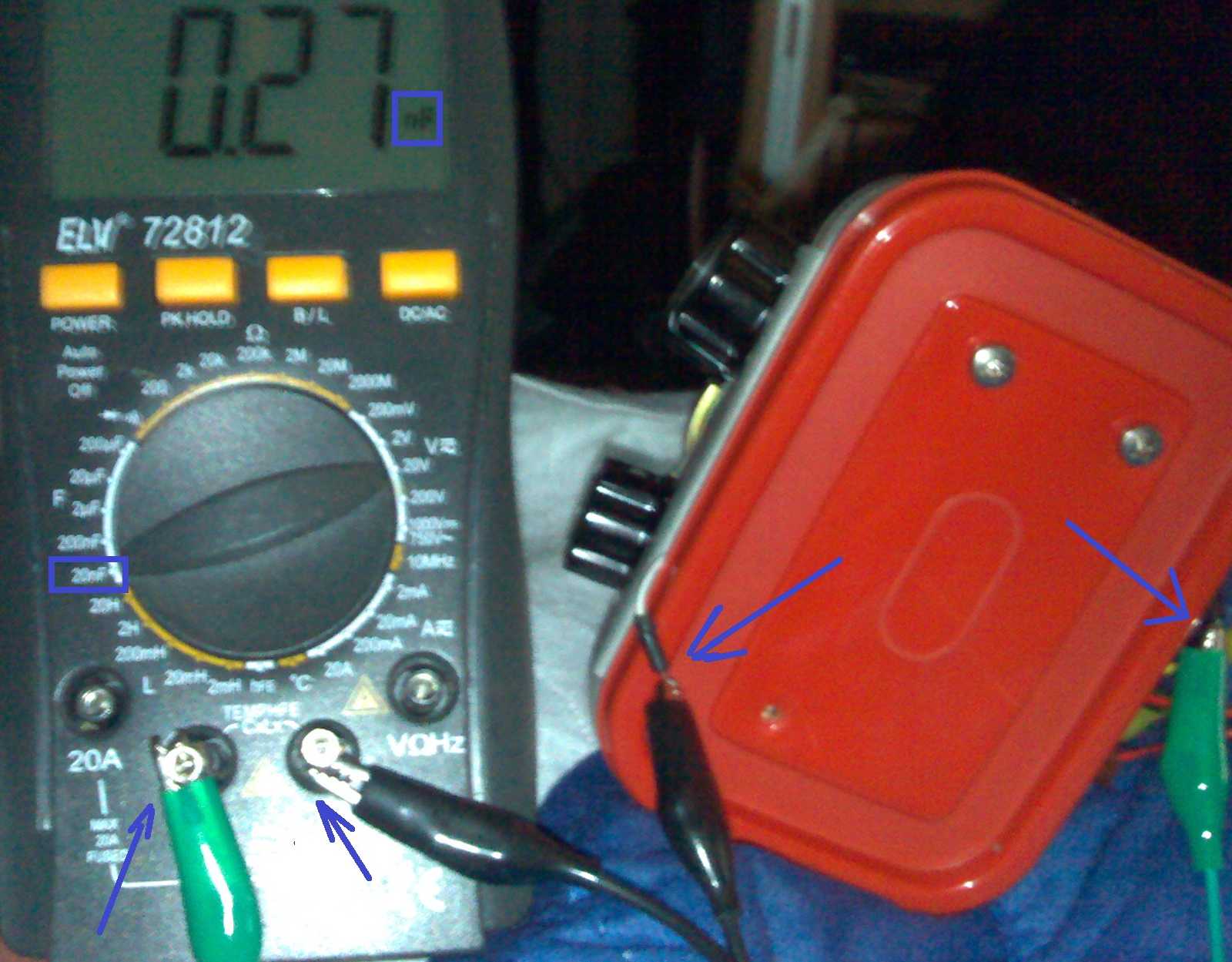 Hello Jan Erstmal kurz zur Beantwortung Deiner Fragen Ich gehe davon aus, dass weiter Interesse besteht, mit den originalen Bauteilen auch Mittelwelle möglichst im gesamten Frequenzbereich zu empfangen. Ja, natürlich, ist mein Interesse. Zu den Messungen: siehe Anhang. Die Ca kann etwas niedriger als 10 pF sein, manchmal flackerte hinten 0,01 anstatt 0,00 auf, bleibt dann aber wirklich bei 0,00 nF stehen. Gemessen an von der Steckplatine getrennten Drehkokabel, verbunden dann mit grünem und gelben Krokokabel zum Meßgerät, siehe Bild 001. Wie wurden die Frequenzbereiche ermittelt? 3 Methoden: Mit der angeratenen Koppelmethode mit einem Zweitradio, mit einem Schaltkreis-ZN414/TA7642-Vergleichsempfänger mit gleicher Spule (wie der Franzis MW-Empfänger) und drittens Vergleich empfangener Sender mit nach meinem Standort regenerierter Liste empfangbarer MW-Sender auf fm-scan.org. Die Ferritantenne braucht nicht unbedingt eine zusätzliche Drahtantenne, diese sollte schwach gekoppelt werden (Begründung siehe voriger Beitrag). Doch eine Drahtantenne + Erde brauchts dringend, sonst ist Nachts keinerlei Empfang von Stationen über 25 Kilometer möglich. Welche Induktivität misst du zwischen Spulenabgriff und dem anderen Ende der Spule? heißes Ende - Abgriff (ca. 20 Wdg. vor kaltem Ende) mHenry 0,191 Abgriff - kaltes Ende (ca. 20 Wdg) 0,024 mH heißes - kaltes Ende (gesamt) mH 0,273 Lässt sich mit dem Drehko + allen Parallelkapazitäten überhaupt eine Konstellation finden, die die ganze Mittelwelle überstreicht? Nein, ich habe es im Austausch des 100 pF Basis-Emitter-Kondensators mit Ersatz von 6,8 pF bis hoch zu 1 µF probiert. Der Überstreichbereich des Drehkos blieb immer in der ersten Hälfte des MW-Bandes.