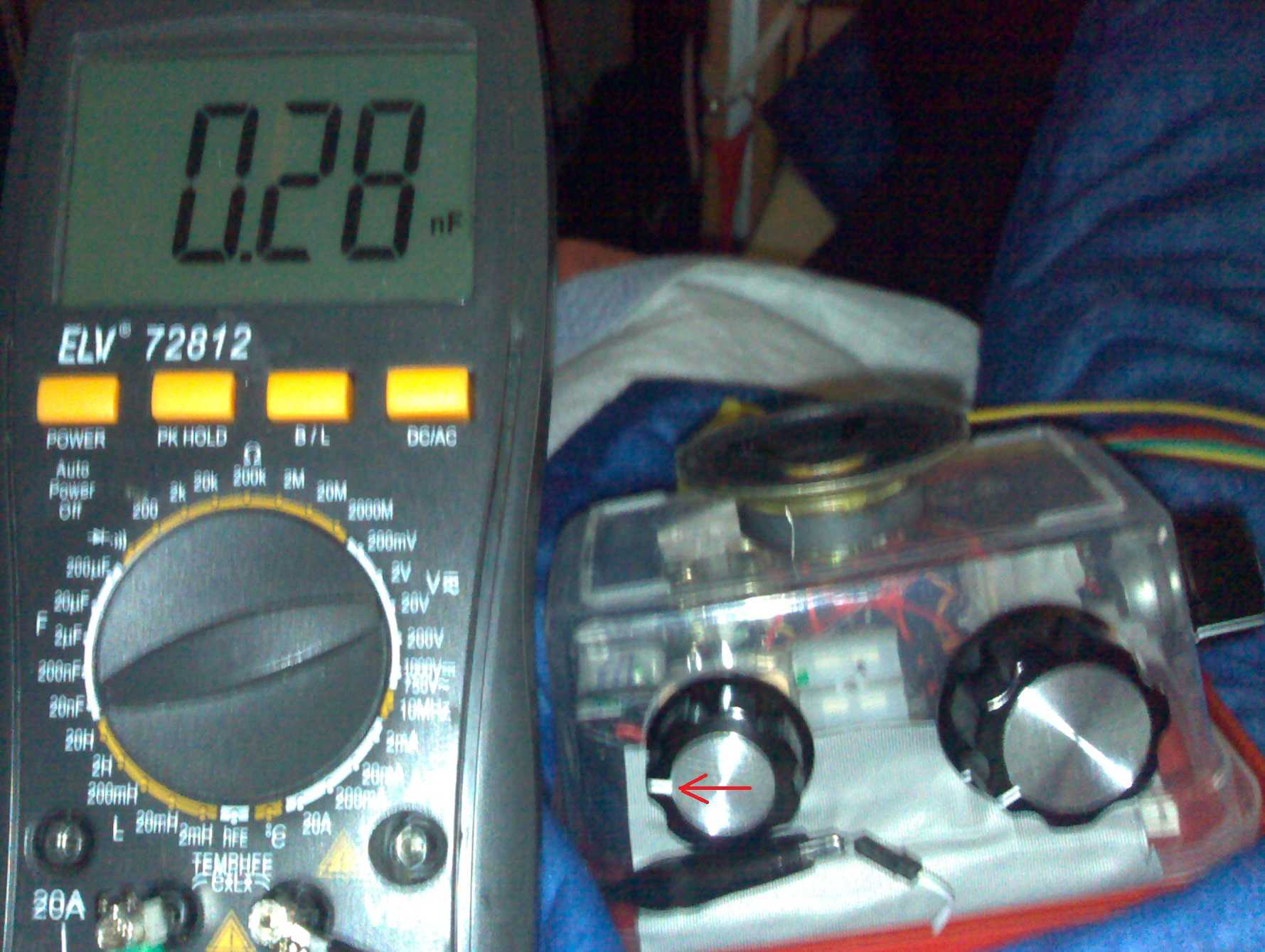 Hallo Yvonne-Ester, deine Mühe lohnt sich, es wird nun klarer. Das Messgerät habe ich auch. In dem kleinsten Messbreich 20 nF ist die Anzeige in 10 pF Schritten und der wirkliche Wert kann deutlich abweichen. Mein Gerät zeigt 4,7 pF mit Null an, bei 8,2 pF schwankt es zwischen 0 und 1 und ab 10 pF zeigt sich die 1 stabil. Das wäre ja nicht schlecht für das obere Bandende, wenn die Anfangskapazität deines Drehkos kleiner als 10 pF ist.