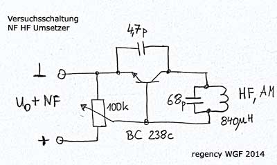 regency:Wie müsste die komplette Schaltung aussehen, welche Werte für die Widerstände, Kondensatoren sind geeignet? Geht das nur mit einem Spitzentransistor, welche Typen kommen in Frage?