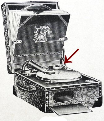 Ne - ich vermute, wir sehen hier wie der Koffer für "Transport" eingerichtet ist. Hinten im Eck wurde die empfindliche Schalldose befestigt, so dass sie beim tragen keinen Schaden nimmt. Möglicherweise ließ sich der Tonarm in dieser Position für den Transport arretieren.