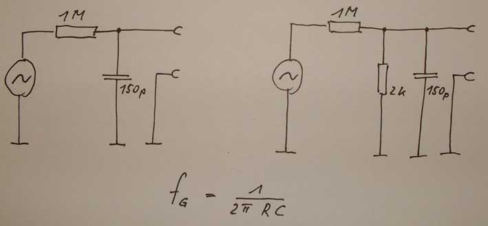 Leiten wir das Tonsignal von der hochohmigen Quelle (z.B. 1M Ohm) mit einem Kabel, das eine Kapazität von 100pF/m hat, zu einem Gerät mit hochohmigem Eingang, so werden wir feststellen, dass die hohen Frequenzen im Tonsignal fehlen.