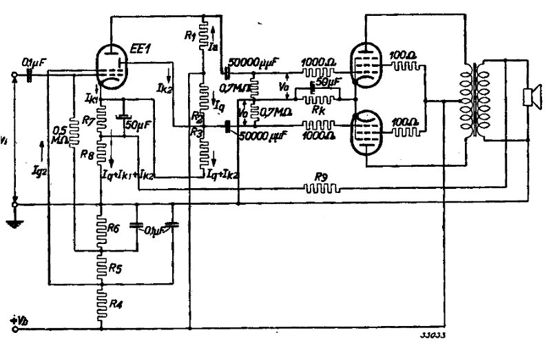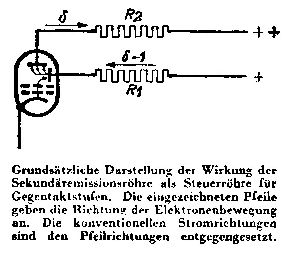 Die Phasenumkehr der EE1 findet als eine Art Stromverteilung statt, so sehe ich das und zwar zwischen k2 und Anode. Ein kleines Schema zeigt das. Die Verstärkung ist sehr hoch, eine Steilheit 17 mA/V reicht für eine einstufige Vorverstärkung mit Phasenumkehr zur Aussteuerung einer EL 50. Das reichte sogar noch für eine Gegenkopplung siehe das Schaltbild, wenn man nicht die volle Verstärkung brauchte. Es gab noch andere Spezialröhren wie Raumladegitterröhren, die auch nicht so oft verwendet wurden.