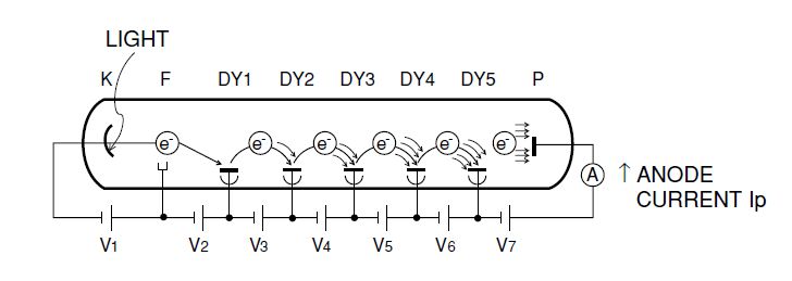 es ist richtig, dass eine Stromverteilung zwischen der Dynode (k2) und der Anode auftritt. Wichtig ist hierbei ist die Verstärkung. Die Elektronen, die auf die Dynode treffen, sollten hier nur jeweils ein Elektron auslösen, die dann weiter zur Anode fliegen. Für eine bessere Verständlichkeit füge ich mal ein paar Bilder hinzu. Sie betreffen zwar Photomultiplier, aber man kann sich ja die weiteren Dynoden wegdenken.