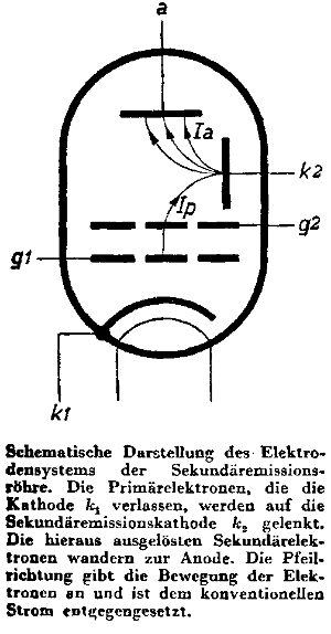 Das Grundprinzip ist bei der Sekundäremissionsröhre (k2) und der Dynode eines Vervielfachers gleich, so wie Du es beschrieben hast. Der Unterscheid ist das ein Tetrodensystem vor der k2 ist. Dieses steuert wie eine normale Röhre über das g1 das System bis zur k2, die ja selber auch eine Steuerfunktion besitzt. Das die EE1 und die Fernsehröhre EE50 keine weite Anwendung fanden ist wohl der aufwendigen Beschaltung von Katode und g1 zu verdanken. Die Katode wird 23 V ! positiv gegenüber Masse vorgespannt und das Gitter über einen Spannungsteiler 20 V. So eine hoch liegende Katode ist nicht einfach zu Handhaben bei einer Röhre mit so hoher Verstärkung, zumindest früher nicht. Der Aufwand für Schirmung etc. wog wohl die Ersparnis einer Röhre als Vorstufe auf.