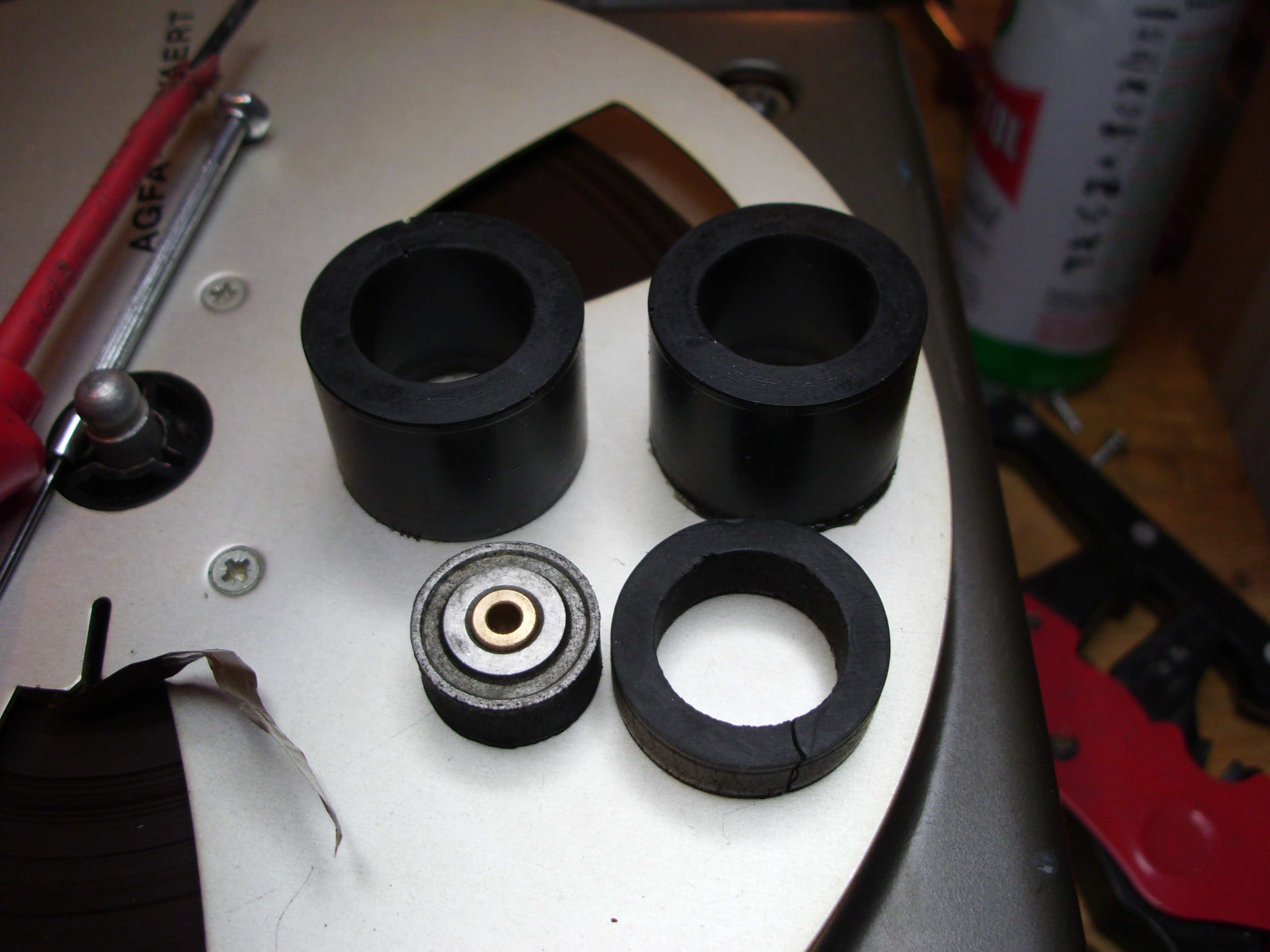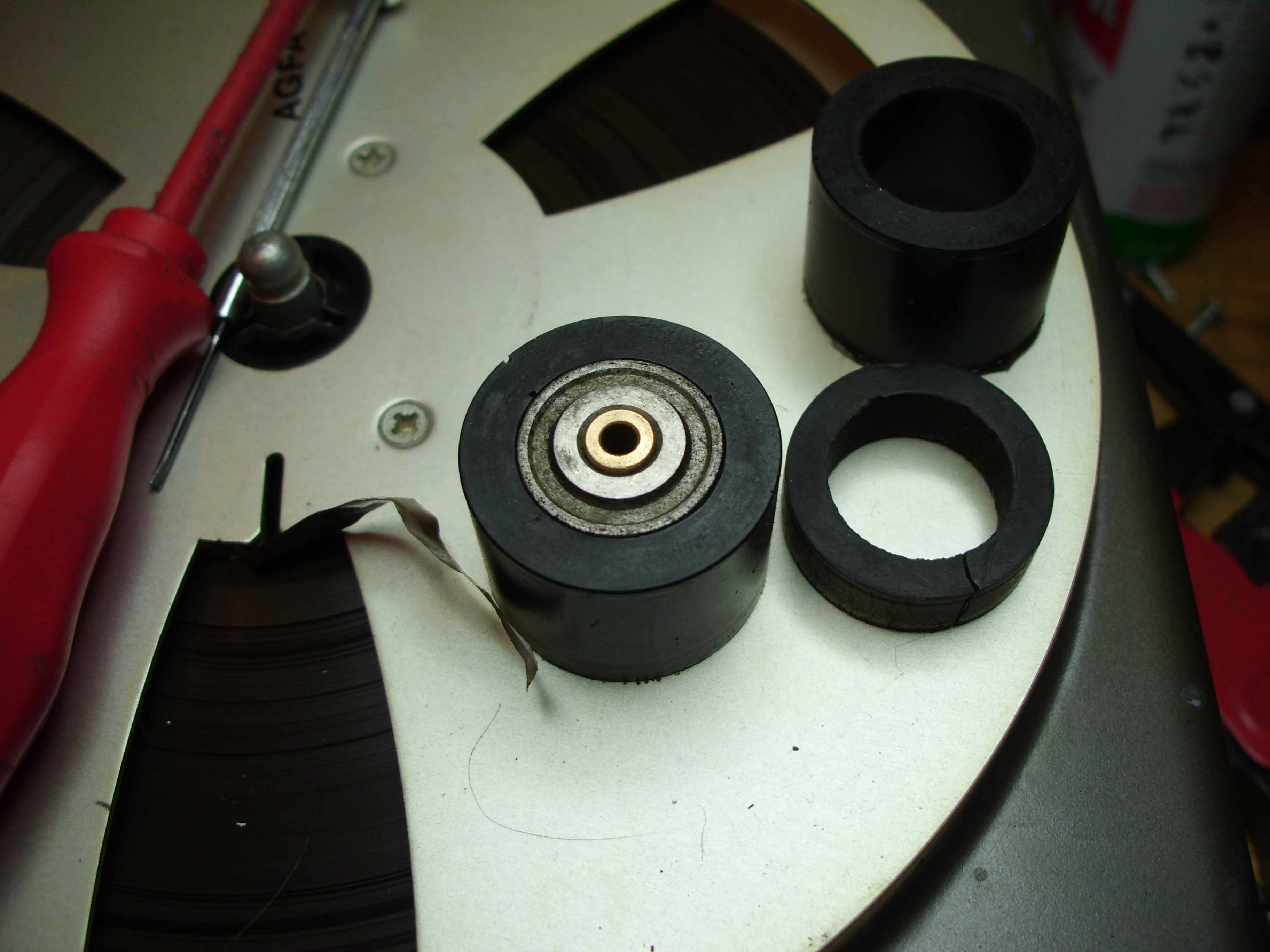 Gestern hab ich aus England eine kleine Tandberg bekommen. Zunächst hab ich mal den Stecker getauscht. Ich wußte nicht das die Enländer ihre Sicherungen im Stecker haben???. Danach ging es zum Probelauf. Vor und Rückspulen ging ohne Probleme. Nur das Abspielen ging nicht. Der Grund ist auf den Bildern zu sehen. Ich habe es recht häufig wenn ich ein Tonbandgerät bekomme das wer auch immer mal irgend wann daran gespielt hat und die Andruckrolle an der Capstanwelle anliegt. Das ist dann natürlich das aus für die Rolle. Letzte Woche hab ich im Keller die Regale umgeräumt. Dabei hatte ich ein TB mit kaputter Rolle in der Hand. Danach zufällig einen Karton mit meiner alten Faller Rennbahn. Und da kam mir sowas wie ein Geistesblitz. Carrerabahn!!!! Ein Freund von mir fährt Slotrennen und die haben Sliks die sie auch regelmäßig ja nach Bahn tauschen. Ich also bei uns in den nächsten Laden und das ergebnis ist auf den Bildern zu sehen. Daraus bekomm ich 4!!! Rollen für 5. Im Netzt kostet die Rolle für die Tandberg oder vergleichbare andere TB's zwischen 20 und 30€