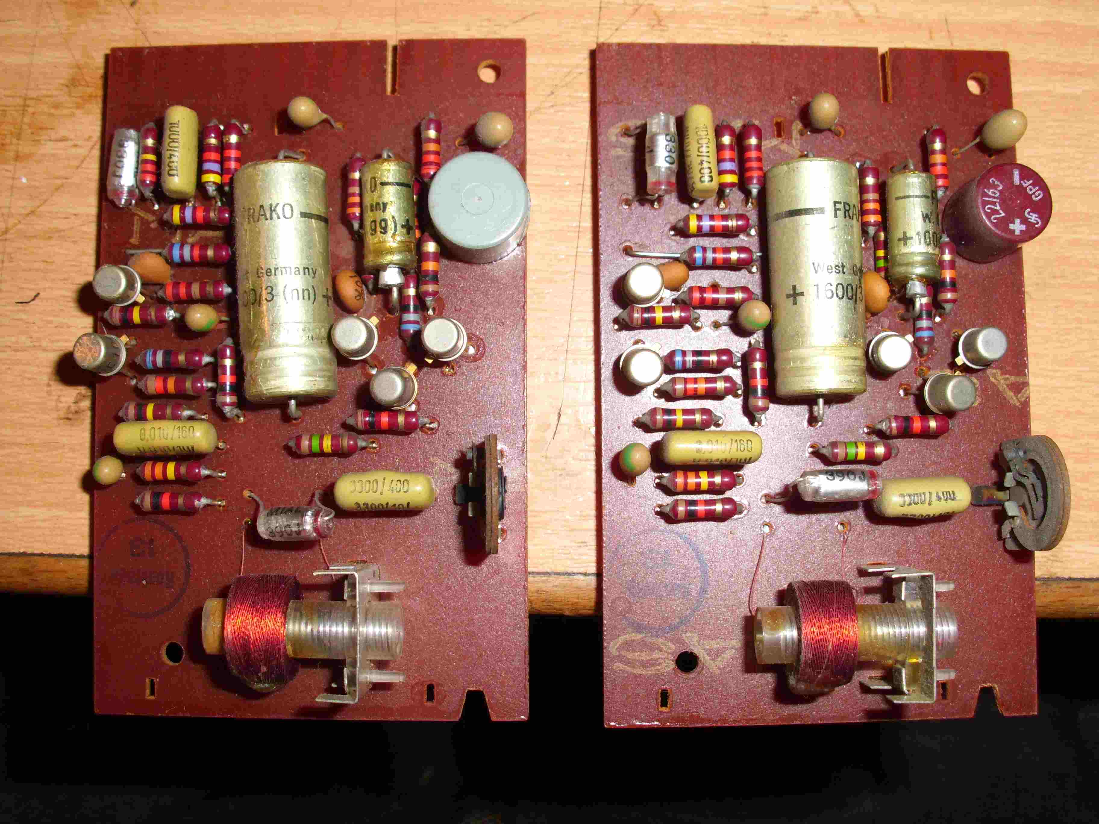 Gestern hab ich mir (leider) mal wieder was zun spielen gekauft. Das Angebot in den Kleinanzeigen war einfach zu verlockend. Der Verkäufer sagte mir am telefon das er die A77 von seinem Bruder geerbt hätte und das sie schon seit jahren im Keller steht und er keine Verwendung dafür hat da er selbst eine GX635 von Akai betreibt. Er wies mich auch darauf hin das sie zwar aufnehme aber beim abspielen ein Kanal fehlt. Als ich bei ihm war sagte er das sie aus einem Tonstudio stamme wo der Bruder sie her hatte. Zuhause angekommen erst mal eingesteckt, Band drauf und getestet. OK, rechter Kanal nicht da. Ich hab sie dann aus dem Gehäuse gehoben und hatte wie man auf den Bildern sieht den Verdacht das da jemand drann war der vorsichtig ausgedrückt in seinem job nicht den besten Tag hatte. Ich hab erst mal die beiden Ausgangsverstärker die man auf den Bildern sieht gegen ein ersatzpaar getauscht. Und was soll ich sagen, sie lief. Die original Platienen hab ich neu bestücht und den dollen Sicherungshalter gleich mit ersetzt. Der graue elko wurde ersetzt und hatte nicht wie der rote(Serie) 63Volt sondern nur 35Volt, deswegen ist der auch etwas außer Form geraten. Die beiden Platienen mit der flugsicherung sind die Leistungsverstärker da die A77 ein Koffergerät mit eingebauten Lautsprechern ist. Ich hab heut dei Bänder aufgenommen und sie läuft bisher ohne Probleme. Die restlichen Steckplatienen muß ich noch machen und dann ist sie wieder schön. der Koffer rechts neben der Revox ist eine A36 aus der ersten Serie