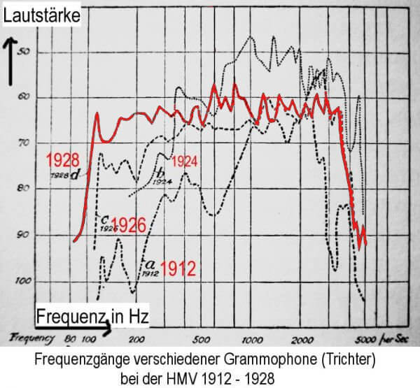In Europa wurden solche Grammophone auch von der HMV, Columbia und Electrola hergestellt. Ausserdem gab es auch "Kopien", welche aber klanglich nicht ganz heran kamen. Hier aus einem alten Buch (1928) verschiedene Frequenzverläufe von Grammophonen. Den Umkehrtrichter habe ich rot eingefärbt: