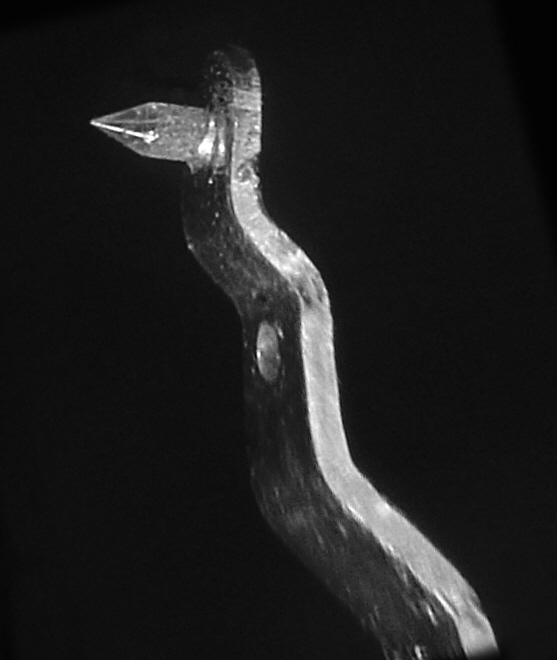 Eine Aufnahme des montierten Saphirs und des geschliffenen Konus. Dabei muss man sich vor Augen halten, dass nur der allerunterste Bereich in die Plattenrille eingreift, deshalb ist auch eine so starke vergrößerung erforderlich wenn man Verschleißspuren erkennen will.