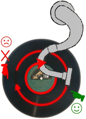 sehe ich im WWW gerade ein Grammophon, wo der Aktustik-Tonabnehmer links von Platten-Mitte montiert ist, die Nadelschräge auch einen Winkel nach vorn hat. Üblich scheint mir der Aufbau rechts von der Plattenmitte zu sein.