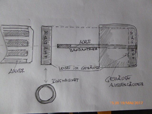 Der mittler Antriebsmotor ein Aussenläufer dreht leider nicht. Wenn er angedreht wird, läuft er, bleibt aber stehen. Kurios ist, dass bei abgezogenem Motor der Ringmagnet lose in der Aussenhülle liegt, mit sehr wenig spiel.