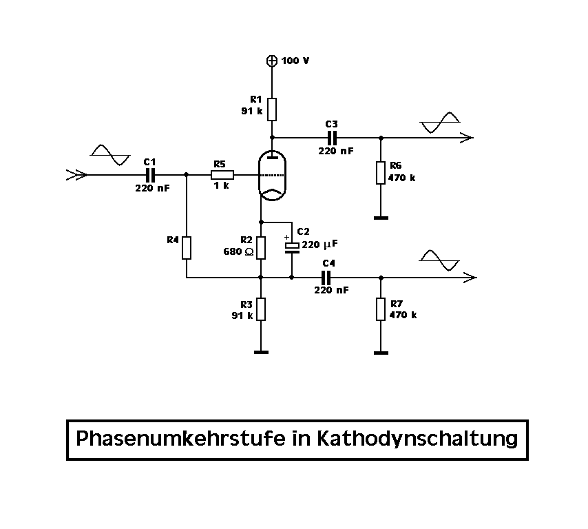 Der Clou sind dabei die beiden gleichen Widerstände an Anode und Kathode, die für ein gegenphasiges Ausgangssignal sorgen, das dann direkt den Endpentoden zugeführt werden kann.