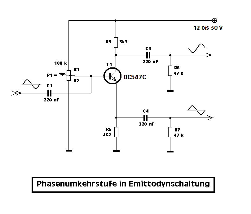 die Schaltung ist tatsächlich nützlich, ich hatte sie auch schon verwendet. Eines ist aber zu beachten: Die Ausgangsimpedanzen der beiden Ausgänge sind sehr unterschiedlich. Während die Impedanz am emitterseitigen Ausgang nur wenige Ohm beträgt, hat die Impedanz am Kollektor etwa den Wert des Kollektor-Arbeitswiderstands. Somit eignet sich die Schaltung so nicht für die Speisung symmetrischer Kabel. Man kann das Problem aber einfach lösen, indem man dem kollektorseitigen Ausgang noch einen Emitterfolger nachschaltet. Das braucht einen zusätzlichen Transistor und einen Widerstand. Die Basis wird direkt an den Kollektor von T1 angeschlossen, der Kollektor kommt auf die Betriebsspannung und der Emitter über den Widerstand auf Masse. Der Widerstandswert hat sinnvollerweise denselben Wert wie der bei T1, damit es möglichst symmetrisch wird.