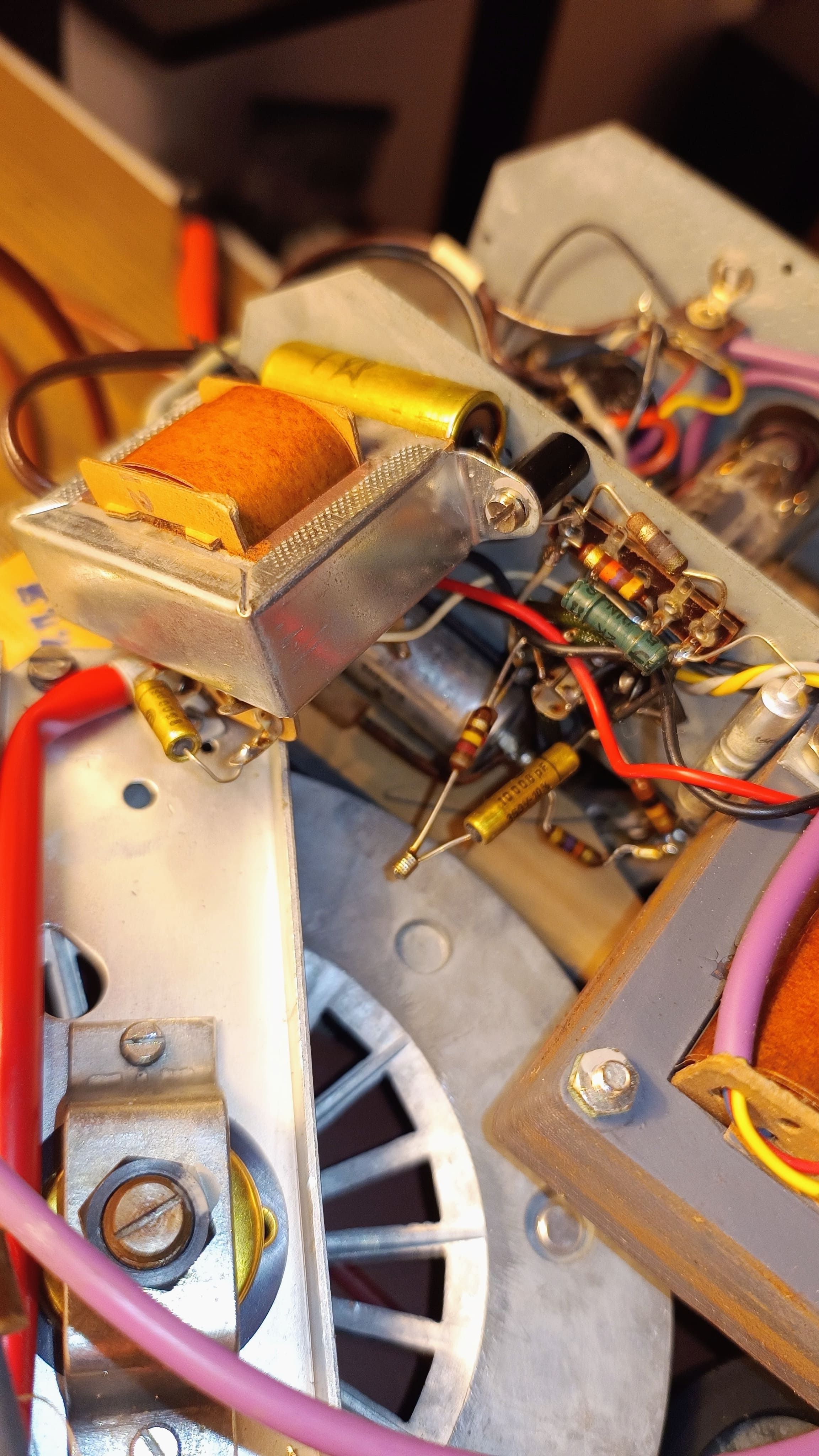 die Hochvolt-Elkos sind meistens noch gut, falls sie im Betrieb nicht heiss werden. Falls sie keine Kapazität mehr haben, würde es stark brummen, dann ist Ersatz angesagt. Die Niederspannungs-Elkos (hat vermutlich nur einen parallel zum Kathodenwiderstand der Endröhre) sind schon anfälliger. Die kann man 'auf Verdacht' ersetzen, wenn man kein passendes Messgerät hat, sie sind ja nicht teuer. Die gelben/goldenen Kondensatoren sehen nach Papierkondensatoren aus, die würde ich ersetzen, mindestens den Koppelkondensator, der von der Anode der Triode zum Steuergitter der Pentode der ECL82 führt. Dieser muss sehr gut isolieren, sonst wird das Steuergitter auf positive Spannung gezogen, was einen erhöhten Anodenstrom in der Pentode bedeutet. Das schädigt auf Dauer nicht nur die Röhre, sondern auch den Gleichrichter, den Netztrafo und den Ausgangstrafo.