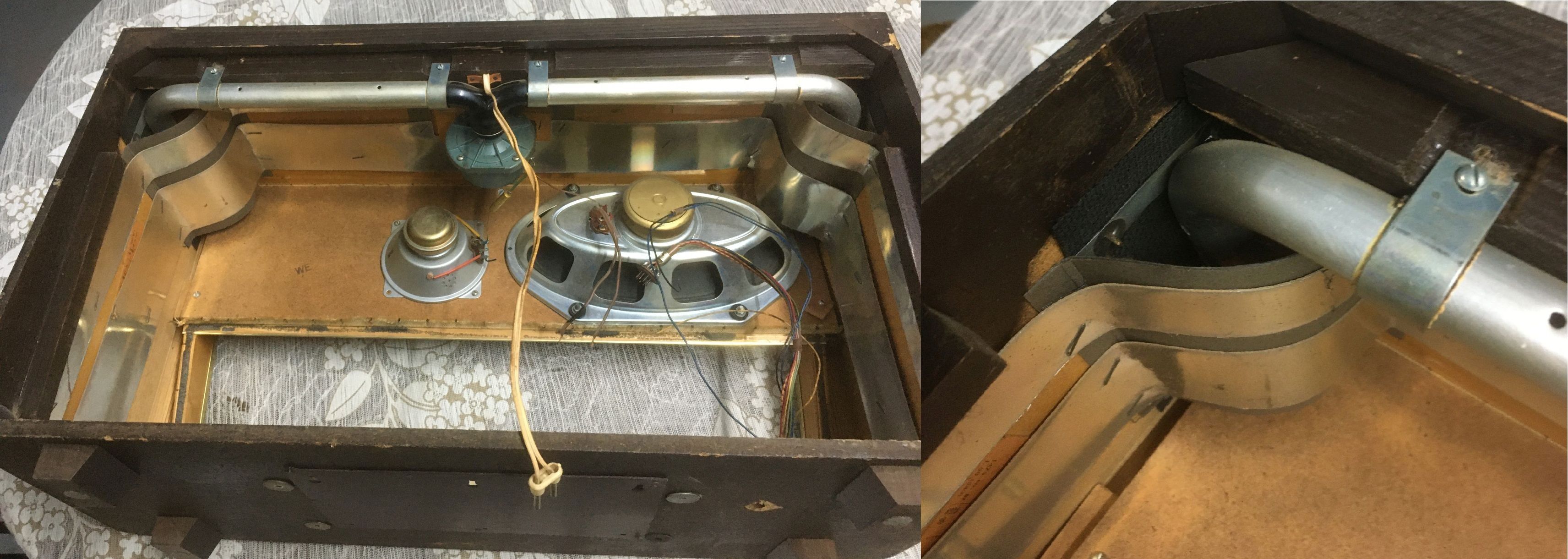 bei der mehrtägigen Instandsetzung eines "Graetz Musica 617" ist mir eine Besonderheit der Lautsprecheranordnung aufgefallen. Über die Instandsetzung selbst möchte ich nur erwähnen, dass es eine Menge Kontaktprobleme in den Röhrenfassungen und dem Tastenblock gegeben hat. Die ausnahmslos zu entfernenden Teerkondensatoren mit fast doppelter Kapazität und reduziertem Isolationswiderstand waren obligatorisch, die Selen-Graetzbrücke und der Becherelko konnten dagegen im Gerät verbleiben. Nun spielt das Gerät wieder wie in seiner besten Zeit. Der Raumklang - nicht mit Stereo zu verwechseln - ist schon beeindruckend und erinnerte mich an meine Kindheit bei Besuchen der Grosseltern, die eine Graetz Grazioso 430 Musik- truhe im Gästezimmer mit Zusatzlautsprecher in der Küche stehen hatten.
