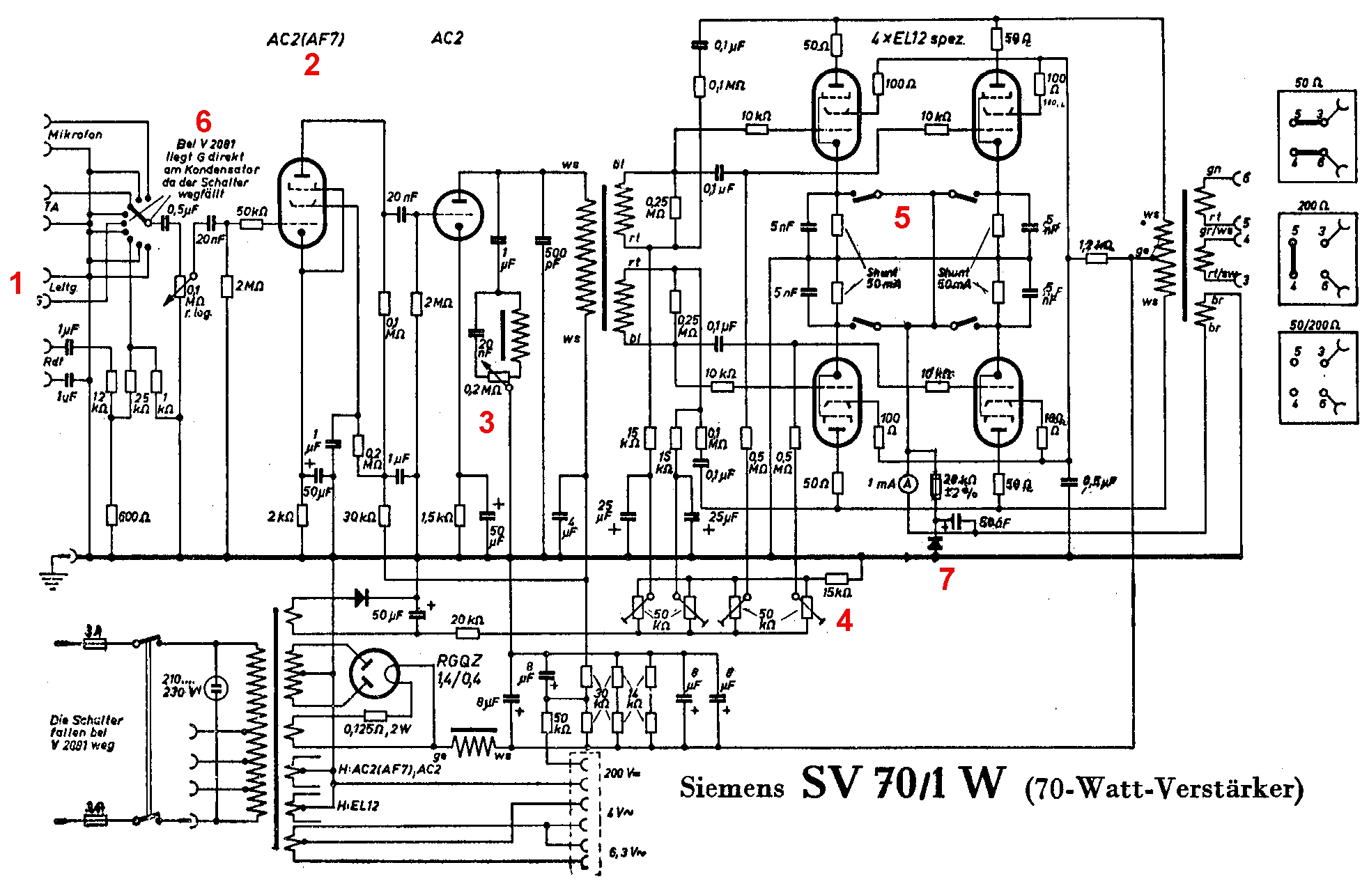 mal wieder ein Blick in ein Schaltbild. Diesesmal ein NF-Gegentakt-Vollverstärker Siemens SV70/1W mit immerhin 70 Watt Lautsprecherleistung von ca. 1939. 70 Watt das ist schon was.