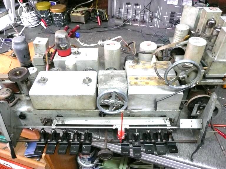 Hallo Jürgen, Hallo Rainer, die beiden vorgestellten Geräte funktionieren. Das Schaub Supraphon bekam ich im erbärmlichen Zustand. Das Chassis mit Drahttonlauferk in der Werkstatt sehr schwer zu hantieren. Angefangen vom def. Skalenantrieb über entrosten von Metallteilen war ich über eine Woche damit beschäftigt, dieses Monster von Radio-Drahtton-Gerät (35kg) wieder einigermaßen zum Spielen zu bringen. siehe Bild 8 Unter Schaub Supraphon 2 ist das Schaltbild dieses Monsters m.f.G. Friedhelm so für Heute schluss ich muß gleich zur Chorprobe. Für Männerchor Interssierte GALA KONZERT http : // www . saengerbund-ghh . de