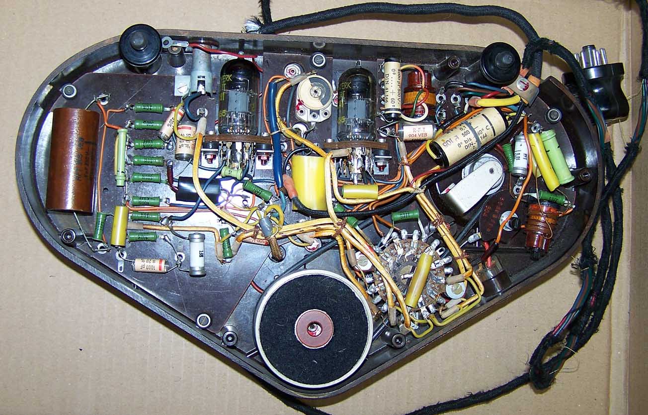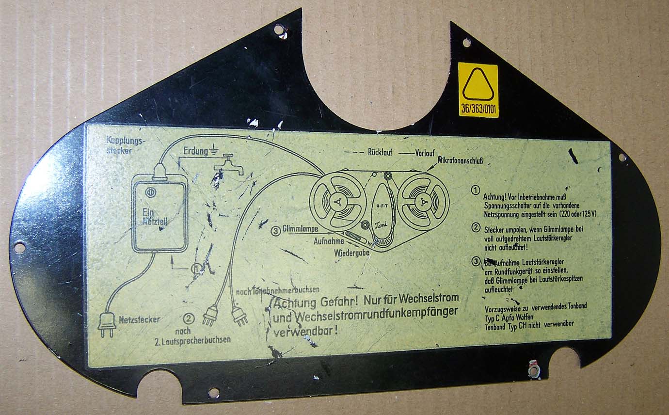Äußerlich sieht es soweit komplett aus, bis auf das ein böser Bube das Aufnahme-Wiedergabe-Kabel abgeschnitten hat. Laut Abbildung auf der Rückseite sind zwei alte NF-Stecker ähnlich der alten 2poligen Netzstecker dran. Nun weiß ich aber nicht wie Die bezeichnet waren , damit man auch weiß was Ein- und Ausgang ist.