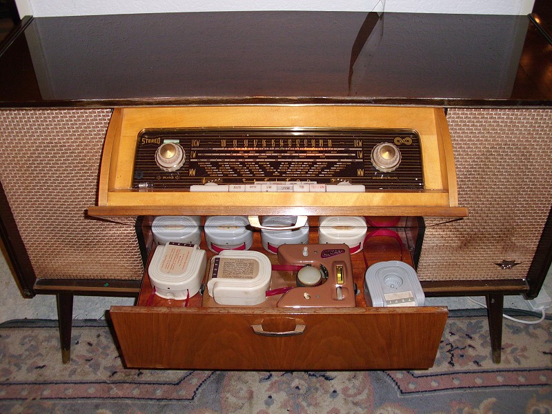 Durch zufall hab ich irgentwo mal einen Bericht über Tefifone gelesen. Seitdem hab ich immer nach einem Tefi Ausschau gehalten aber leider nie etwas Bezahlbares gefunden. Dann fand ich auf dem Flohmarkt ein Tefi KT1. der Preis wahr angenem und ich nahm es mit. Der Gesammtzustand ist sehr gut, nur das System ist leider hin. Da ich jetzt richtig Infiziert war hab ich dann immer wieder mal in der Bucht Ausschau gehalten. Irgentwann stand mal eine Tefitruhe mit funktionierendem Radio und defektem Tefi drinn. Ich hab dann mal 10€ geboten und bin mittags zur arbeit gefahren. Abends hab ich dann mal nachgesehen für wieviel die Truhe weggegangen ist und konnte es kaum glauben als beim Einloggen das übliche Herzlichen Glückwunsch kam. Ich hab die truhe dann ein paar Tage später mit meinem Neffen abgeholt. Nachdem sie im Flur stand hab ich sie eingeschaltet und das Radio lief. Ohne Antenne nur WDR2 aber immerhin. Beim Tefi hing der Motor fest. sonst sah es noch gut aus. Ich hab dann vorsichtig etwas WD40 an die Lager gesprüht und es eingeschaltet. Nach zwei oder dreimal anschubsen drehte der Motor. Erst langsam und nach kurzer Zeit lief er vollkommen normal. Mein 16jähriger Neffe konnte es kaum fassen und als von den " Schallbändern " noch Musik kam verlor er fast den Glauben an die moderne Technik Seitdem läut die Truhe fast jeden Tag und der Klang ist mehr als Überzeugend. Leider ist über die Tefis kaum etwas zu finden. Wenn jemand zufällig von meiner Truhe etwas an Unterlagen da hat bitte melden. Ich bin für alles dankbar