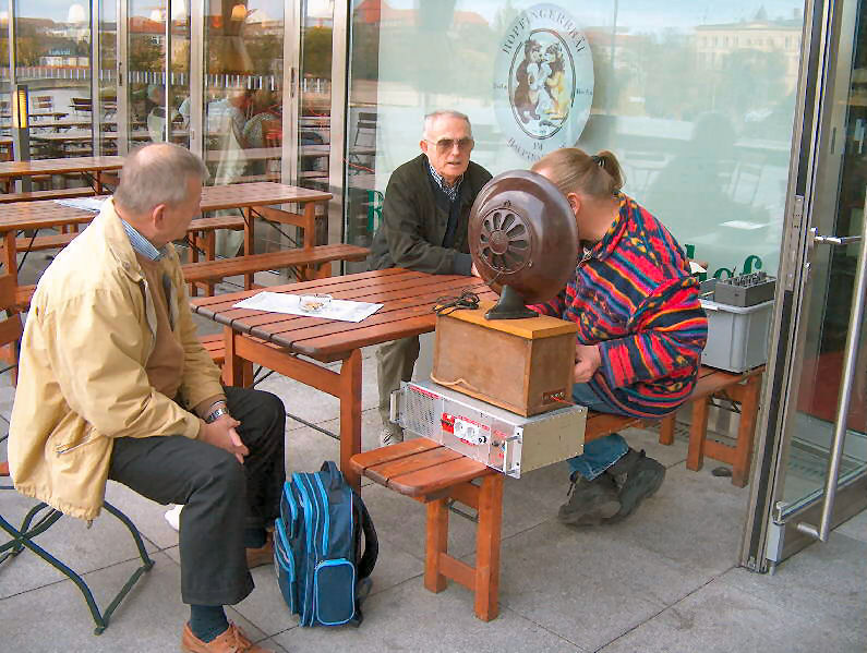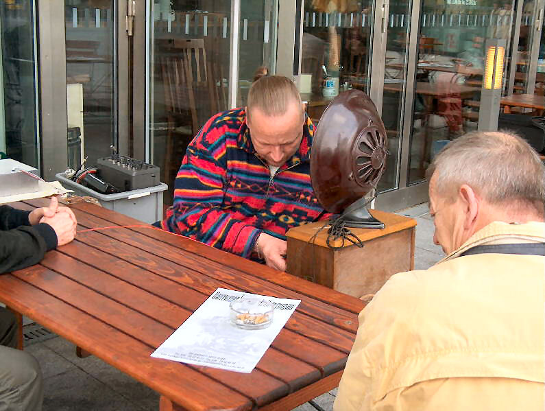 Es war doch draußen auf der Terrasse ein toller Erfolg, als Jürgens rund 80 Jahre altes Radio Stassfurt L4 Töne von sich gab (Empfang vom Deutschlandsender) und wir alle gespannt um den alten passenden Philips-Lautsprecher "herumhörten".