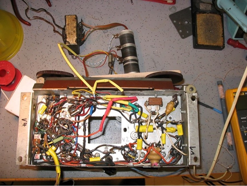 Hallo zusammen, ich habe vor einiger Zeit in dem bekannten internet Auktionshaus ein amerikanisches Philco 48-360 Röhrenkofferradio ersteigert. Hier nun der Reparatur Bericht: er beginnt mit Überraschungen; bei Demontage und erstem Überblick stellt sich heraus es handelt sich um ein Philco 46-350 und nicht um 48-360 mit der Konsequenz dass die nach Unterlagen beschaffte Endröhre 3LF4 falsch ist. Richtig wäre die 3Q5GT. Auf ihrer Position steckt dem Sockel nach eine Gleichrichter Röhre AZ 33 ( Nur 4 Stifte mit Sockel OC3 keine leserliche Beschriftung ) . Der Lautsprecher klemmt lose zwischen Chassis und Gehäuse. Die übrigen Röhren 1T4 2 X 1R5, 1U5 und 117Z3 haben allen intakte Heizungen und stecken auf den richtigen Positionen. Das Netzkabel ist abgeschnitten und ganz offensichtlich ist auch schon mal eine Batterie ausgelaufen. Die eingebaute Drahtantenne ist deshalb beschädigt. Soweit der erste Status, ich werde weiter vom Fortgang berichten sobald ich mir eine 3Q5Gt beschaft habe.