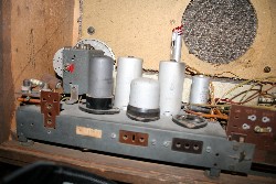 Ihr seht bei den Anhängen neben dem Frontfot zwei Blicke ins Innere und die zerstörte Röhre. Da, wo ich den Stift reingesteckt habe, saß die AZ 11, die zerstörte vorn in dem dunklen Steckplatz(vorn aus Sicht des Betrachters). Typen-oder sonstige Bezeichnung ist nicht zu finden. Wellenbereiche 6-18 Mhz,550-1600 kHz,150-so 300 kHz (laut Skala). Zwei Drehknöpfe vorn, ein kreuzformiger Drehschalter an der Seite.