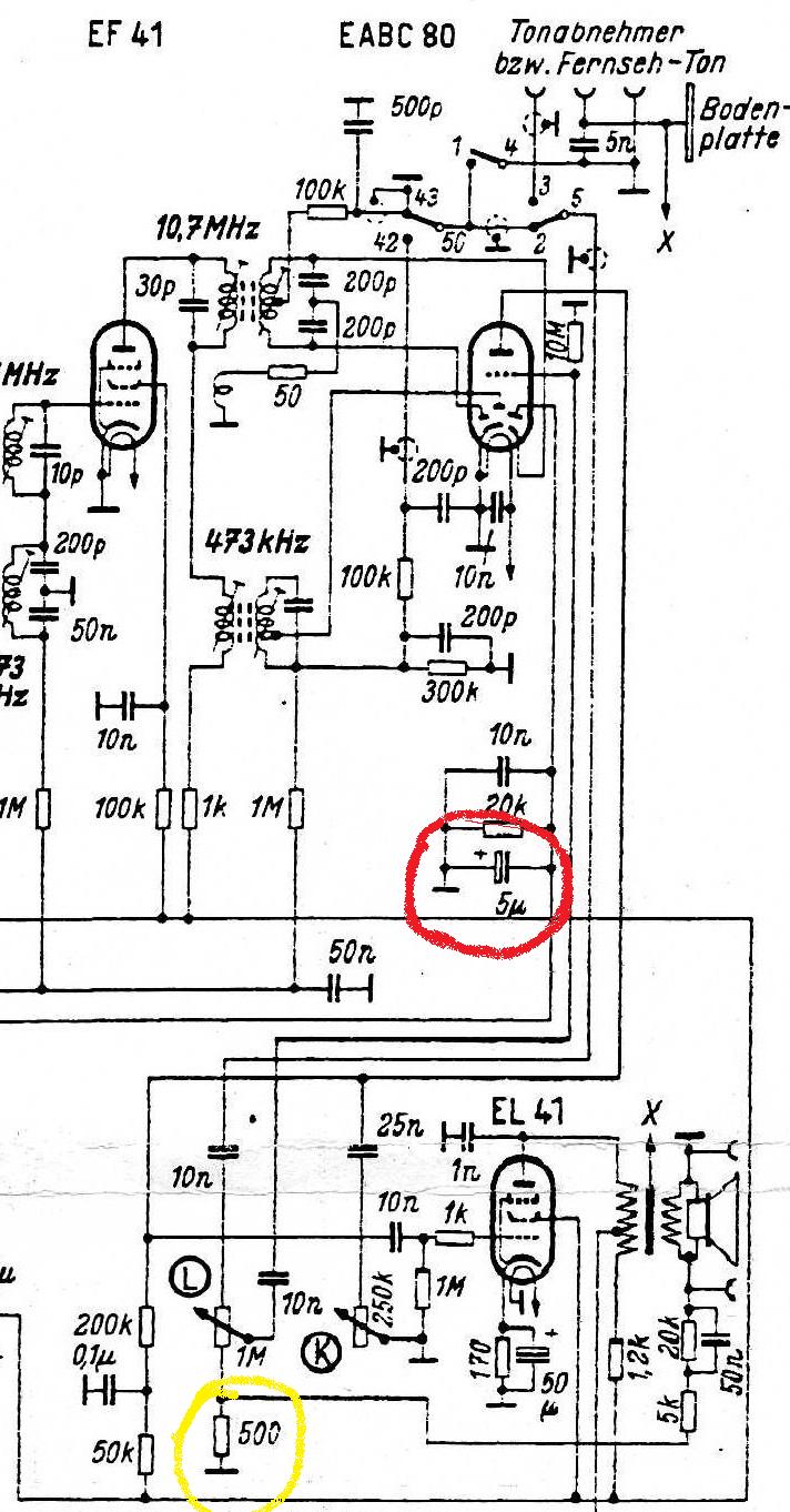 Bei den Röhren konnte ich nur die EABC 80 tauschen, da ich noch eine zweite hier habe. Daran liegt es nicht. Die EL 41 habe ich leider nicht doppelt. Als Gleichrichter ist in dem Radio ein AZ41 eingebaut. Diese habe ich durch eine Diode mit Vorwiderstand ersetzt, da der Heizfaden der alten AZ41 durchgebrannt ist und ich erst schauen wollte das alles in Ordnung ist, bevor ich eine neue AZ41 einsetze. Mich hat nur gewundert, dass es mit dem 1 kOhm Widerstand tadellos funktionierte, bzw. bis auf das Hubschraubergeräusch, bei Drehung des Höhenreglers. ich habe die Masse des 500 ohm Widerstandes an versch. Massestellen probiert, leider ohne Erfolg. Viele Grüße Paraninio