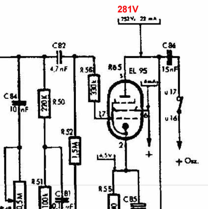 Sind die Spannungsangaben auf dem Schaltplan (kann sie ehrlich gesagt kaum entziffern) so zu verstehen, dass sie an dem angegebenen Punkt gegen Masse durchzuführen sind? Die Angabe am Messpunkt zwischen C86? und der Röhre EL95 - heisst das 252V und 22mA?
