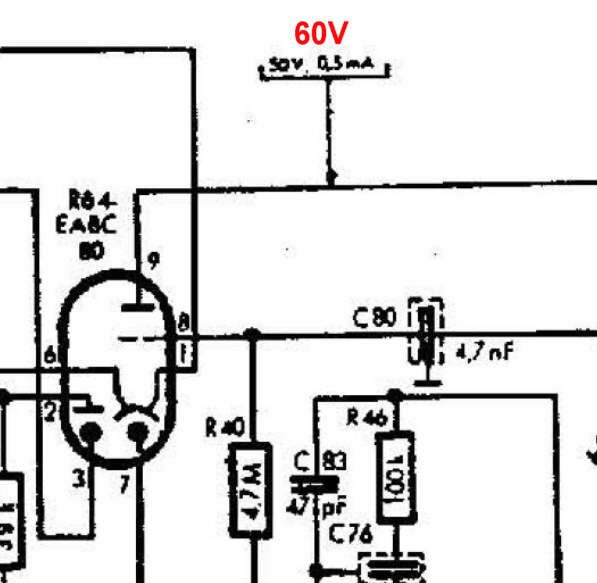 Aber zum Thema: Ja, das heißt dort 252V und 22mA, die mA kann man messen, besser gesagt berechnen indem man die Spannung an der Kathode misst, dort steht 4,5V, wenns dort stimmt sollte es passen. Was hast Du mit dem Kondensator C76 gemacht? Und mit dieser Abschirmung? Dort ist eine recht empfindliche Stelle, da ist die Regelspannung drauf und bei TA kannst Du einen Brumm über eine Masseschleife bekommen, oder wer weiß was, so ein Blech gehört da nicht hin und der rote Draht auch nicht. Mach mal das Blech ab und schau mal dort nach, oder mache ein neues Foto, man kann ja nicht sehen was dort Sache ist. Tausch aber zuerst mal den C80 aus, wenns Radio vorher nicht richtige gegangen ist und dort die Spannung nicht stimmt dann kommt auch sowas heraus wie Du es beschreibst, und wenn dann der Rest besser geworden ist dann hört man diesen Fehler auch nur besser.