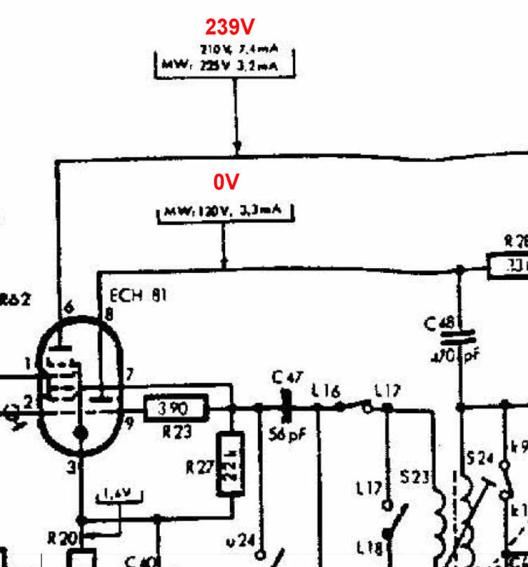 solche und ähnliche "Fehler" die während einer Reparatur auftauchen geschehen meistens durch Übereifer oder auch mal durch "RaM crowded", Arbeitsspeicher überfüllt, man sieht den Wald vor lauter Bäumen nicht. Beim Arbeiten an sämtlichen Elektrogeräten darf das aber eigentlich nicht vorkommen, Ersteres schon mal gar nicht. Ist vielleicht einfach gesagt, aber wenn man nicht mehr weiß wo Vorn und Hinten ist dann sollte man eine Pause machen, das Gerät beiseite stellen und sich in aller Ruhe den Schaltplan durchsehen. Die gesamte Elektronik ist logisch aufgebaut, wenn "A" dann "B" oder wenn "C" dann "A+B", folglich gilt dann auch: "Wenn C=0 dann A oder/und B = 0", das bedeutet in Deinem Fall: "Wenn Anode ECH81=0 dann u20 - u19=off", oder "R28=tot", oder "k17-k16/L3-L2=off". Im Plan unten links steht über der Tastatur dieser Satz: "Die angegebenen Spannungs- und Stromwerte gelten für den UKW-Bereich (Ausnahme MW). Spannungen wurden...", deshalb gilt: "eine Pause machen, das Gerät beiseite stellen und sich in aller Ruhe den Schaltplan durchsehen." Natürlich wird man auf eine Frage wie Deine auch eine Antwort bekommen, aber besser ist es wirklich erst einmal selbst zu suchen, nicht nur der Erfolg freut einem wenn man es selbst gefunden hat, man hat auch dabei etwas gelernt, das ist ähnlich wie wenn man in der Schule bei einer Prüfung einen Sitznachbar fragt wo man sein Kreuzchen hinmachen soll, Prüfung vielleicht bestanden, aber nutzen tuts nicht wirklich... (Kurze Unterbrechung - musste aufs Enkelchen aufpassen...)