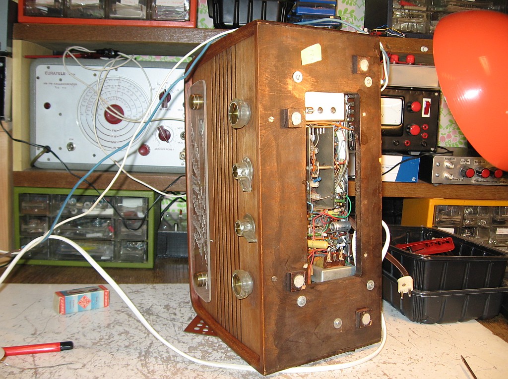 hatte eben einen merkwürdigen Fehler an einem kleinen Radio mit der Röhrenbestückung ECC85 ECH81 EF89 EL84 EZ80 und einem Magischen Auge entdeckt. Alles ist noch in freier Verdrahtung aufgebaut. Bei UKW schien immer die Sender wegzulaufen bzw. wurden die Sender plötzlich leiser und mussten nachgestellt werden. Der Austausch der ECC85 ergab dasselbe Ergebnis. Dann stellte ich fest, dass es ein Wackelkontakt sein muss. Wackelte man am Bandwahlschalter, dann änderte sich die Empfangslautstärke auf UKW und nur auf UKW. Das Reinigen der Kontakte des Schalters brachte nichts. Ein Abklopfen mit dem Holzstab ergab irgendwo einen Wackelkontakt an oder unter der Fassung der ECH81 oder am 1. Bandfilter. Erst vermutete ich ein Wackelkontakt an der Röhrenfassung der ECH81. Eine Reinigung brachte nichts. Auch das Nachlöten an der ECH81-Fassung brachte keinen Erfolg. Klopfte man am Gehäuse des 1. Bandfilters, trat der Fehler immer noch auf. Die Anschlüsse des Bandfilters lötete ich nach und der Fehler verschwand. Durch die Hebelwirkung der eingelöteten Bauteile übertrugen sich die Kräfte vom Bandwahlschalter auf die Fassung der ECH81 und dann weiter über ein anderes Bauteil auf die Anschlüsse des 1. Bandfilters.