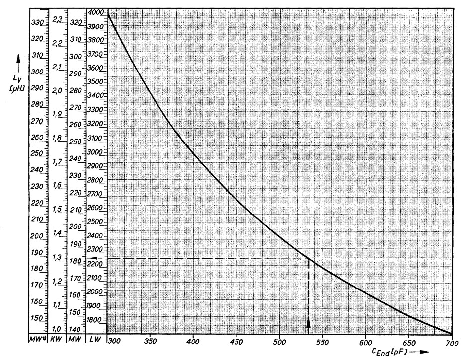 Wenn alle Kondensator-Stricke reißen da hab ich noch ein schönes Nomogramm, mit dem könnte man die Spulen einigermaßen vergleichen, falls diese nicht O.K. sind. Auch für die Oszillator C's hab ich eins zur Not, aber auch Formeln.