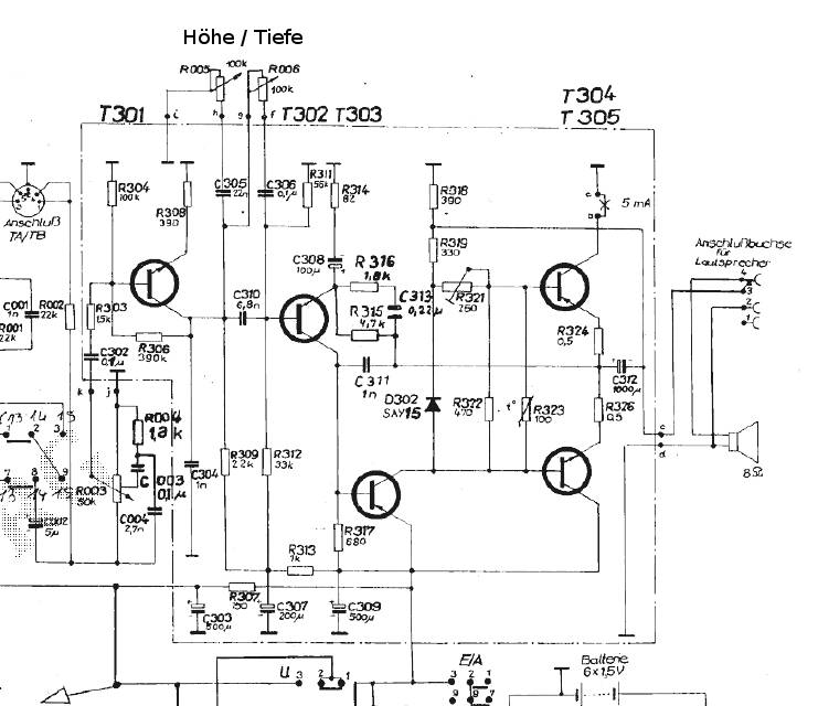 Zum Nachweis wäre ein Oszillograf das beste Mittel, ersatzweise eine HF-Tastspitze mit DVM (läßt sich leicht provisorisch selbstbauen). Alternativ kann man versuchen, HF-Schwingungen 'gewaltsam' zu unterdrücken. Bei Dir z.B. : a) C313 und C311 einseitig ablöten. b) Auf 'motorboating' überprüfen. Eventuell genügt schon das Ablöten. c) Eine Kapazität von ca. 3nF zwischen Kollektor und Basis T303 anbringen. Diese letztere Maßnahme kann zu hörbarem Verlust an hohen Tönen führen. Wenn es dann immer noch 'motorboatet', kann man jedenfalls HF-Schwingungen ausschließen. Ist die Störung damit beseitigt, könnte man anschließend versuchen, durch schrittweise Verringerung der Kapazität zwischen Kollektor und Basis T303 einen brauchbaren NF-Frequenzgang wiederherzustellen. C313 und C311 sollten dann abgetrennt bleiben.