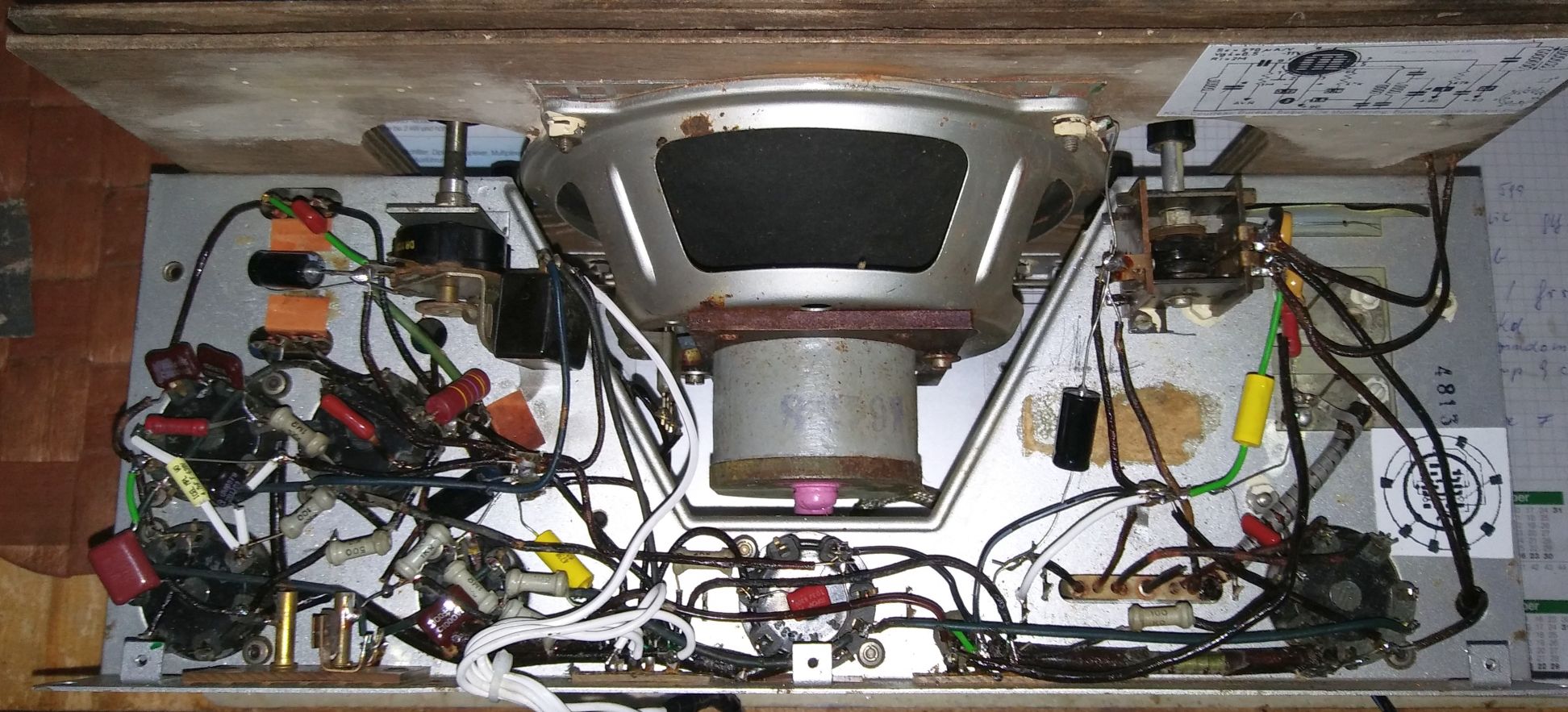 Das mit Kunstleder bezogene Holzgehäuse zeigte Wurmbefall und war am Platz der offenen Bleibatterie durch Säure beschädigt. Wenn jemand diese kleinen, scharfkantigen 1 mm Löcher entdeckt, dem kann ich nur raten, sie mit Holzkit zuzuschmieren und nach 48 Stunden nach- zusehen, ob sich etwas verändert hat. Meistens ja, und hier hilft nur eine Wärmebehandlung: Eine Stunde mit 55 Grad oder 2,5 Stunden mit minimal 48 Grad Celsius. In die Sonne legen nützt nichts, die Tierchen krabbeln in ihren Kanälen an die kälteste Stelle und haben so eine Überlebenschance. Ich habe den Backofen mit Umlufteinstellung bei 70 Grad gewählt. Um Holzrissen vorzubeugen wäre aber die feuchte Sauna besser. Auch die Holzfrontplatte zeigte Wurmbefall, sodass das ganze Radiochassis für 2 Stunden bei 70°C in den Backofen ging. Dadurch setzte sich der Friktions-Drehkoantrieb bombenfest, konnte aber nach Herausdrehen der "Bremsnippelschraube" und Einspritzen von Kriechöl wieder flott gemacht werden.