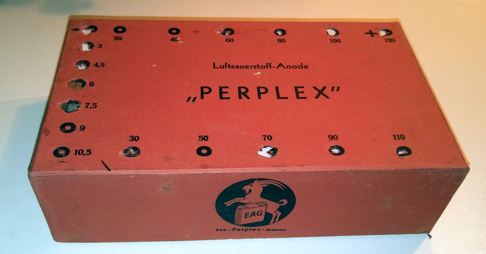Die Abdeckung der urspünglichen Anodenbatterie "EAG Perplex" konnte ich weiter verwenden. Eine zurechtgezimmerte Sperrholzbox beherbergt nun 24 Flachbatterien a 4,5V. Die sind im Instustrie-Zehnerpack gar nicht mal so teuer. Im Neuzustand ergeben sich knapp 120V, und nach Erreichen der Entladeschluss-Spannung dürfte die Spannung kaum unter 100 Volt fallen. Während die Anodenbatterie mit der Kapazität von 6Ah das Original übertreffen dürfte, ist der Heizakku mit 10 Ah nur knapp halb so gross und müsste nach 12 Stunden nachgeladen werden. Das ist aber kein Problem, denn so häufig wird das Gerät nicht laufen, obwohl es aufgrund der beiden Rahmenantennen und dem wohlklingenden Lautsprecher schon saugut spielt, und die Empfindlichkeit nur selten die Aussenantenne erfordert.