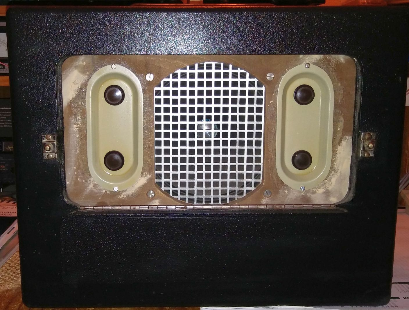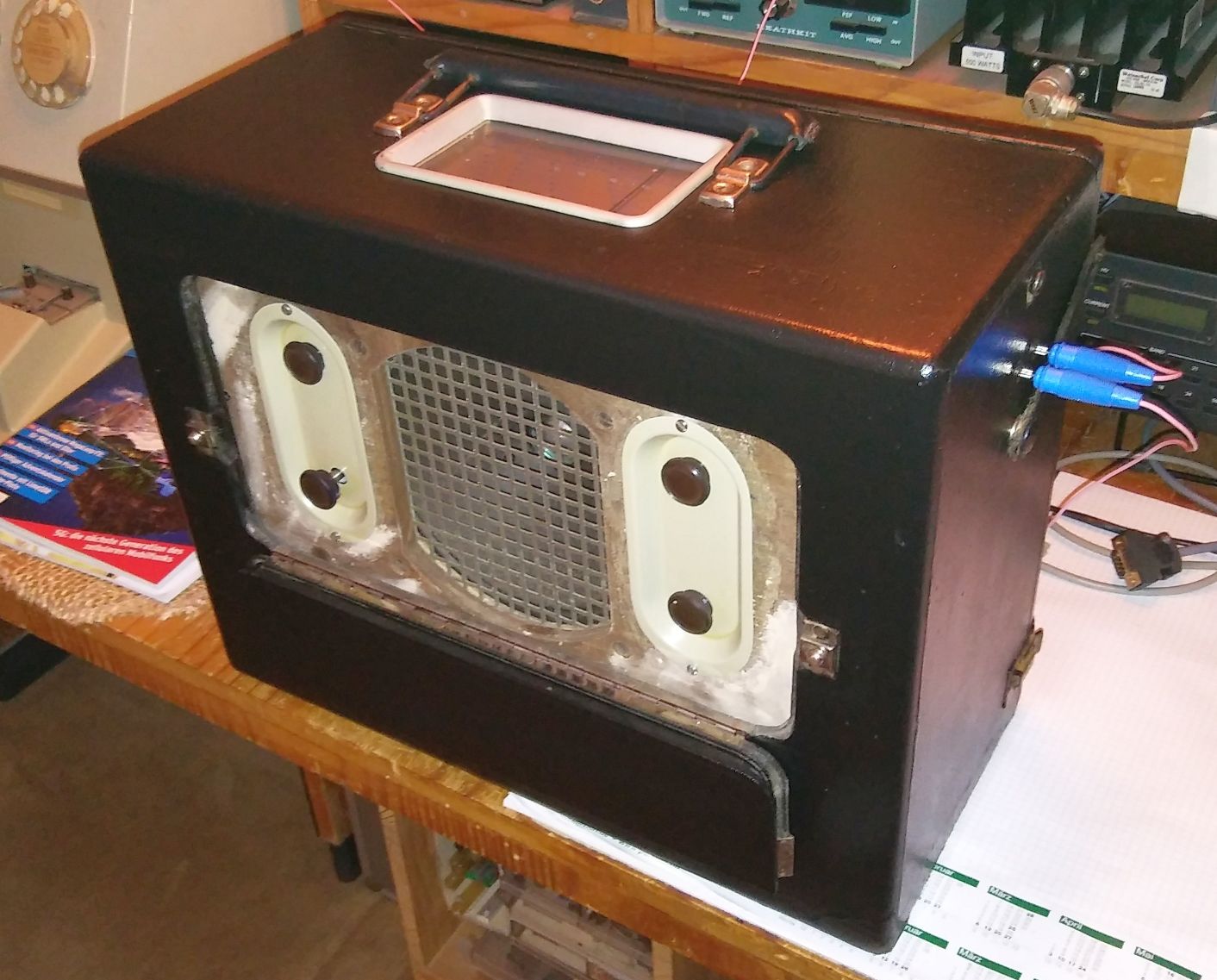 Es bleiben noch 2 Probleme offen: Auffinden eines passenden Lautsprecherbespannstoffs Mitte Januar in Polen und M3,5 Madenschrauben für die alten Drehknöpfe. Wenn alles fertig ist, kommt noch ein Abschlussfoto.