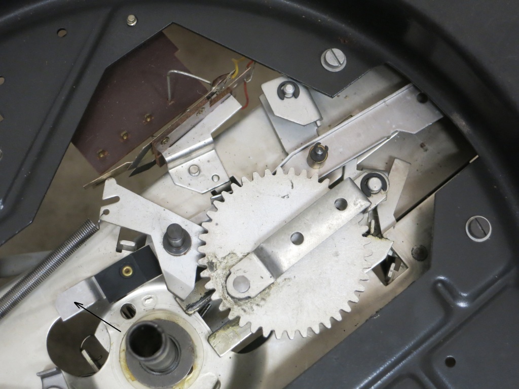 Wenn man den Plattenteller abnimmt, ist der Antrieb der Mechanik ersichtlich. Dabei fiel mir ein Hebel auf, der im weitesten Sinn ermöglicht, dass der Tonarm ausgehoben wird und andererseits durch eine Nase an der Plattentellerachse getriggert wird. Die Stellung dieses Hebels ist hier zufällig und kann leicht um seine Achse geschwenkt werden, bzw. ändert er seine Position schon, wenn das Chassis leicht gekippt wird. Könnte es sein, dass eine Feder fehlt, die ihn in einer Grundposition hält oder dass eine Stange, die zur Stopp-Taste führt eingehängt sein muss?
