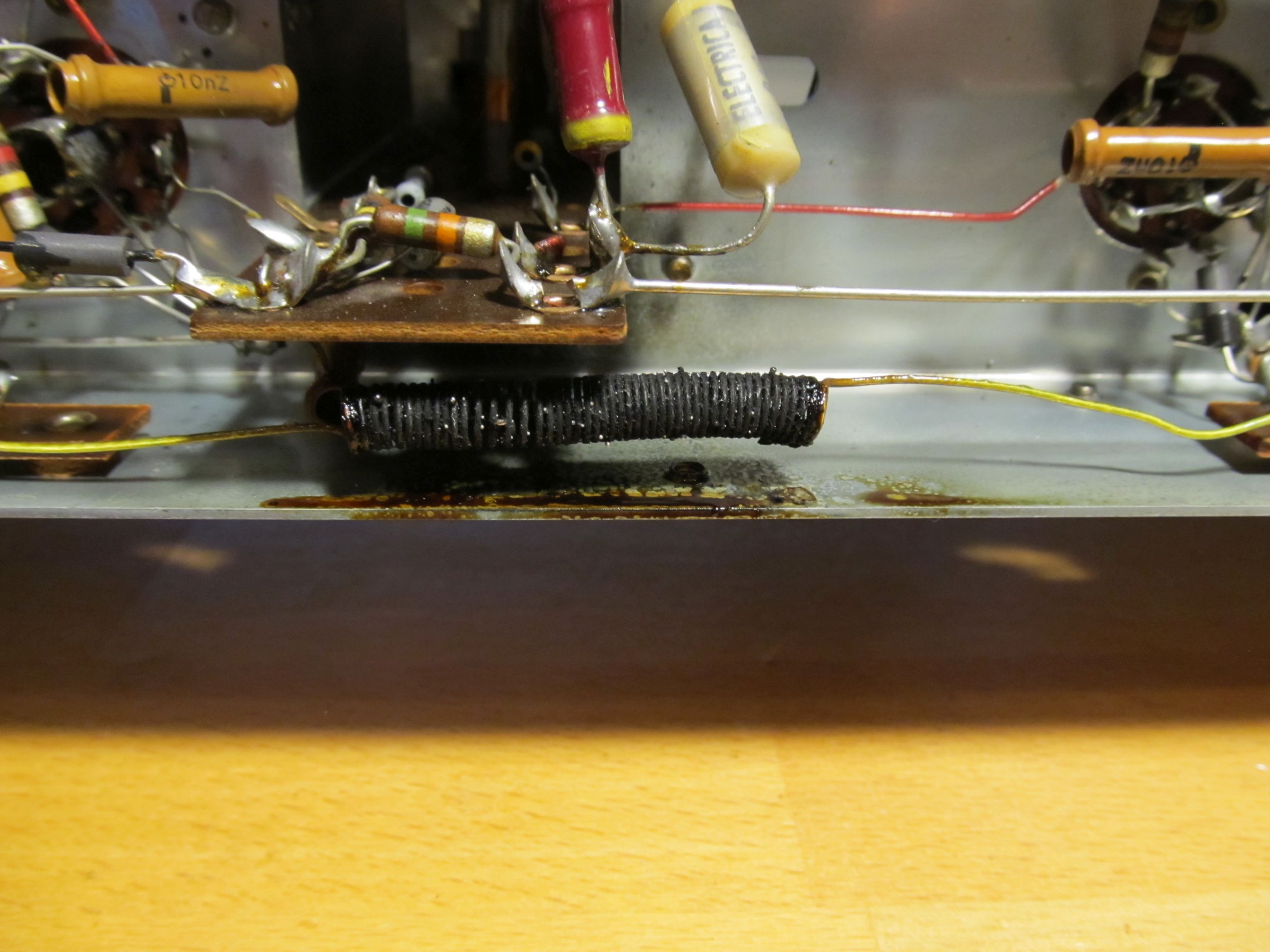 so wie ich dein Foto interpretiere, gibt es einen kleinen Widerspruch zum Schaltplanauszug. Nach Foto würde ich sagen, dass die Heizspannung vom Trafo zur ersten Drossel geht und von dort zur zweiten, während gemäss Schaltplanauszug die Drosseln nicht in Serie geschaltet sind. Bei Serieschaltung (so wie ich das Foto interpretiere), reicht ein Kurzschluss am Ende, damit beide Drosseln überhitzen. Das kann z.B. ein Kurzschluss in der Röhre sein oder auch eine verbogene Lötfahne am Röhrensockel, die dann bei Bewegung der Röhre einen Kurzschluss verursachen kann. Die Heizleistung vom Trafo reicht dann locker, um den doch recht dünnen Schaltdraht zum Glühen zu bringen. Somit solltest du diesen Pfad genau auf mögliche Kurzschlüsse prüfen. Die Kondensatoren dürften eher nicht die Ursache sein, denn hier müssen mehrere Ampère geflossen sein, und das passiert bei den üblichen Kondensatorfehlern nicht, zumal die Spannung mit 6.3V sehr tief ist. Ansonsten ein schünes Radio, und mit Gegentaktendstufe und zwei ZF-Stufen auch elektrisch ein edles Stück.
