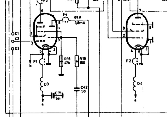 es sind wohl die Drosseln D3 und D4 im Schaltplan gemeint? Drosseln im Heizkreis dienen der Abblockung von HF-Spannungen. D3 muss wenigstens den Heizstrom von der ECH81 und der ECC85 (im Tuner) vertragen können, sowie D4 nur den Heizstrom der EF89. Dass die so heiß geworden sind, deutet auf einen Masseschluss hinter den Drosseln in Richtung zu den Röhren hin. Muss aber nicht sein und bei dem Gerät ganz normal sein, dass die heiß werden (kenne das Chassis nicht).