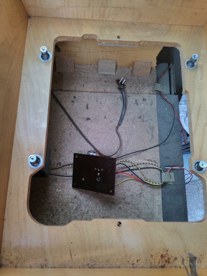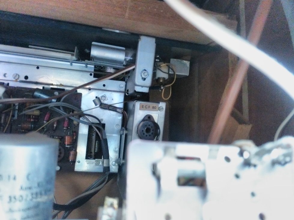 Meine Vermutung ist, dass sich hinter dem Chassis am Deckbrett der Truhe an den vier Stiftschrauben die Nachhallspirale befunden hat. Hinter dem von vorne rechten Tieftonlautsprecher befinden sich hinten 2 Stiftschrauben und vorne die Vorrichtung für eine Blechlasche, die ich so von dem separaten Trafo aus der Nordmende Visabella 1965 kenne.