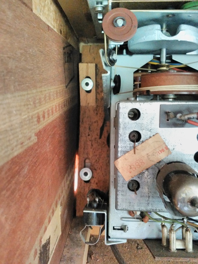 Dort vermute ich die Reglerkonstruktion. Evtl. Ragte eine Potiachse in das Plattenspielerfach ähnlich der Stereoeinstellkombination aus der Nordmende Arabella 59 3D stereo Exquisit 59 3D stero bzw. Cosima 59 3D stereo. In diesen Geräten wurde dem Radiochassis ein Monoverstärker für den 2. Kanal hinzugefügt, dessen Leistung über ein Poti/Schalteraggregat im Plattenspielerfach eingestellt wurde.