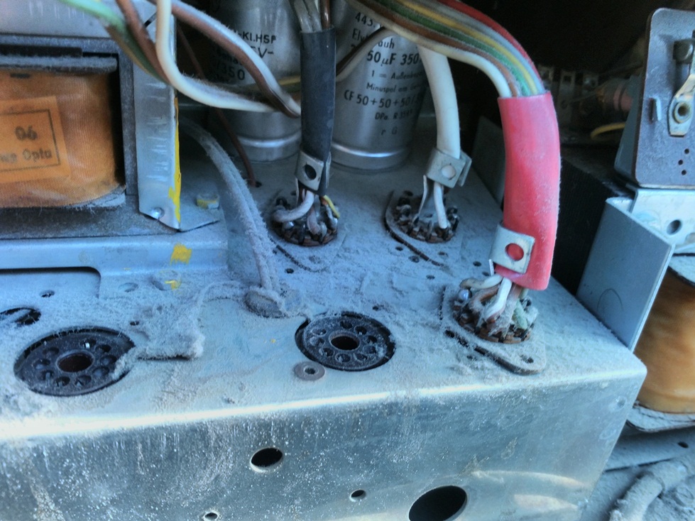 Der Zusatzverstärker der Loewe-Opta ist von unten vom LS-Fach verschraubt. Wie aber sieht es mit dem ebenfalls senkrecht hängenden Empfangsteil aus. Wo ist dieser angeschraubt.