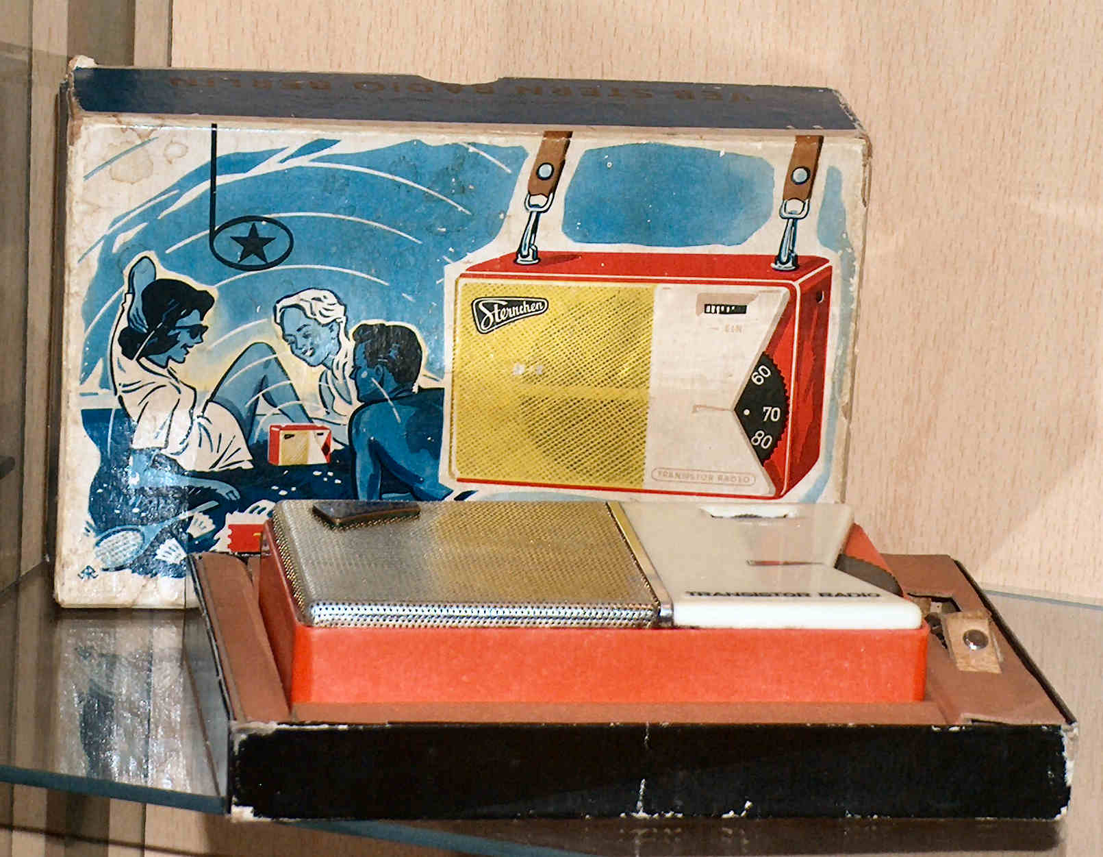 Hier noch das Bild eines Sternchen vom VEB Stern Radio Sonneberg mit dem Originalkarton. Die dunkle Skalenscheibe weist auf den Hersteller Sonneberg hin, die durchsichtigen Scheiben wurden in Berlin verwendet. So ist eine Zuordnung der Hersteller zumindest möglich, wenn auch nicht völlig sicher. Das rote Sternchen im zweiten Bild ist ein "Sonneberger". Bei diesem Gerät wurden in seinem Leben der Lautsprecher und die Endstufentransistoren ersetzt, alles andere ist original.