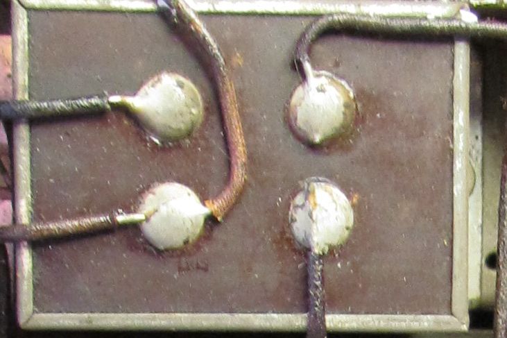 So weit daneben war das nicht. Ich habe inzwischen die unten angehängte Verbindung auch gefunden. Vier Drähte kommen zusammen (einen habe ich abgeschnitten). Die scheint tatsächlich punktgeschweisst zu sein. Nicht nur kein Lot, die schwebt auch einfach in der Luft. Dies ist wirklich ein eigenartiges Radio.