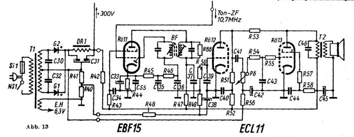 Hier nochmal ein Ausschnitt zum offenen UKW Tuner (zum Schaltbild seitenverkehrt, d.h. links Oszillatorkreis). Nach meinem Verständnis: Die Pentode verstärkt das Eingangs-Antennensignal, der Abstimmkreis liegt in der Anodenleitung und speist über eine Anzapfung HFseitig das Gitter der Triode, die gleichzeitig Misch- und Oszillatorstufe ist (selbstschwingende Mischstufe). Nach einem ZF Filter 10,7 MHz gehts dann zu zwei ZF-Stufen, weiter zum Phasendiskriminator mit der Doppeldiode EAA 11 gefolgt von der NF-Vor- und Endstufe.