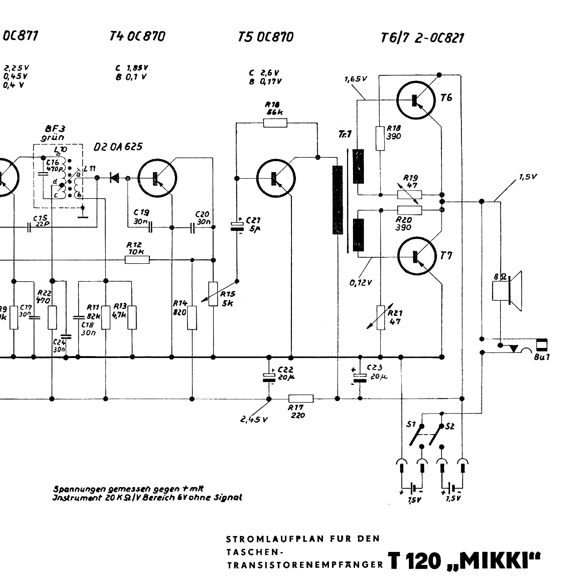 Zum Taschenempfänger Mikki möchte ich anmerken, daß der Ersatz des Lautstärkereglers problematisch wird. Der Grund liegt in der zweipoligen Ausführung des Ein/ Aus- Schalters. Der Lautsprecher liegt in einer Brückenschaltung. Dabei bildet der Mittelpunkt der Endstufentransistoren einen Zweig, der andere Brückenzweig ist der Mittelpunkt der beiden Zellen. Es müssen also beide Batterien abgeschaltet werden.