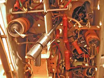 Der fehlende Spannungsteiler für die Schirmgitter scheint keine Probleme verursacht zu haben. Denn bei meinem Radio ist zwar schon der zusätzliche 100 Ohm Widerstand an der Anoder der Triode drin, eine vom Hersteller gemachte Veränderung gegenüber den ersten Geräten gleichen Typs. Da hätte man sonst auch an der Schirmgitterbeschaltung was verändert.