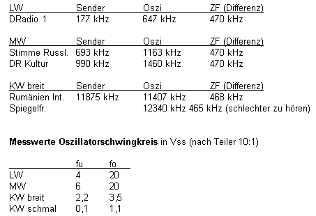 Dann habe ich an den Oszillatorschwingkreis (der Gleichspannungsfrei ist) mit 10:1 Kabel den Oszi angeschlossen. DAS GERÄT SPIELTE JETZT AUF ALLEN BEREICHEN!! Dann ohne Kabel - nix schwingt mehr. Vermutung lage auf Masse, die der Oszi mitbringt (ist es nicht) und dass die Eigenkapazität des Kabels eine Rolle spielt. Jetzt habe ich die Oszillatorspannungen am Schwingkreis unteres (fu) und oberes Ende (fo) gemessen und die ZF mit verschiedenen Radiosendern bestimmt. Hier ein paar Ergebnisse: