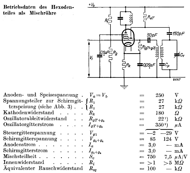 Das Radio ist ein gutes Beispiel dafür, wie man mit geringen Aufwand aber geschickter Planung und Ausführung viel erreichen kann. Allerdings macht mich ein Schaltungsdetail etwas stutzig. Nämlich die Speisung der Schirmgitter der ECH 42 und EAF 42 (ZF) mit nur einem Vorwiderstand von 27 K. Philips selbst gibt an die Speisung der (des) Schirmgitters(s) soll unbedingt über einen Spannungsteiler 27 K + 27 K erfolgen. Einiger meiner Radios mit der ECH 42 haben einen solchen Spannungsteiler. Die Schaltung des BD 390 ist hier ein bisschen zu sparsam geplant meine ich, natürlich müssen die ca. 4 mA vom Netzteil zusätzlich bereitgestellt werden. Die Betriebsdaten als Mischröhre mit diesem Spannungsteiler R1/R2 von Philips selber. Kleiner Nachtrag: Beim Lesen von Philips Schrifttum wird bei KW Osz. Spulen eine Sonderspule beschrieben. Diese Spule müsste im obigen Plan S 14 sein. Diese soll eine Aufschaukelung verursachen. Die Frequenz, bei der diese Spannungsaufschaukelung maximimal ist, wird hauptsächlich durch die Kombination Sonderspule und Kopplungskapazität bestimmt und es wird empfohlen diese Resonanzfrequenz außerhalb des Oszillatorfrequenzgebietes zu halten. Somit ist da auch noch eine "Stellschraube" denn die Kopplungs C sind laut Plan Trimmer.