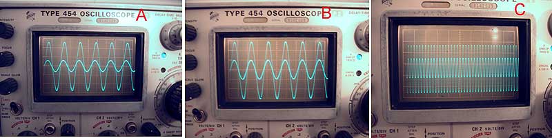 Bild A) MW bei 2V/DIV und Bild B) MW zum Test mit 100 pF parallel an C15 (Soll 56 pF). Bild C bei 0,2 V/DIV und KW. Die Verhältnisse sind nicht schlecht, die Amplitude bei KW halt etwas klein. Beim Empfang macht sich das wenig bemerkbar.