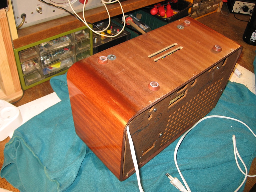 so schnell ist das Radio doch nicht fertig. Beim Polieren bin ich nicht ganz nach unten gekommen, was auch zu sehen wäre, wenn das Radio auf Augenhöhe auf einem Regal stehen würde. Ein unhaltbarer Zustand. Deshalb habe ich das Radio auf den Kopf gestellt und die beiden unteren Ecken poliert: